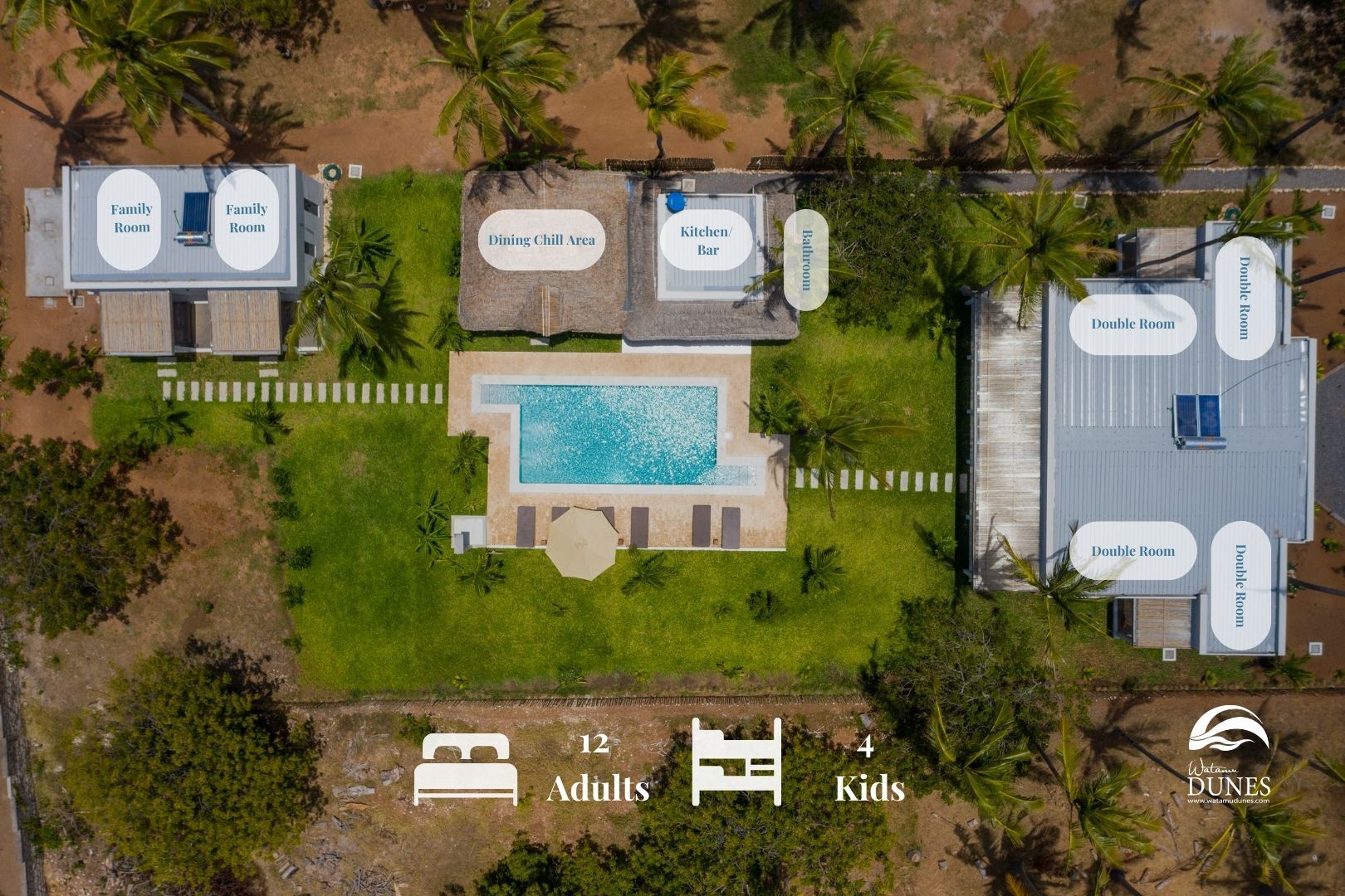 Our exclusive Villa in Watamu, surrounded by palm trees, has two welcoming residences with one house of 4 spacious characterful en suite double rooms.